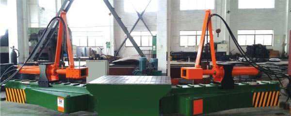 沈陽拉彎廠的型材彎曲機為弧線下調(diào)式結(jié)構(gòu),上輥軸固定,兩下輥軸圍繞一中軸相對于上輥軸分別作弧線升降運動,型材彎曲機的功能主要是預(yù)彎型材的端部和使型材彎曲變形,同時兩下輥軸也為主傳動軸,由液壓馬達驅(qū)動,使彎曲變形的型材卷制成形。